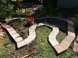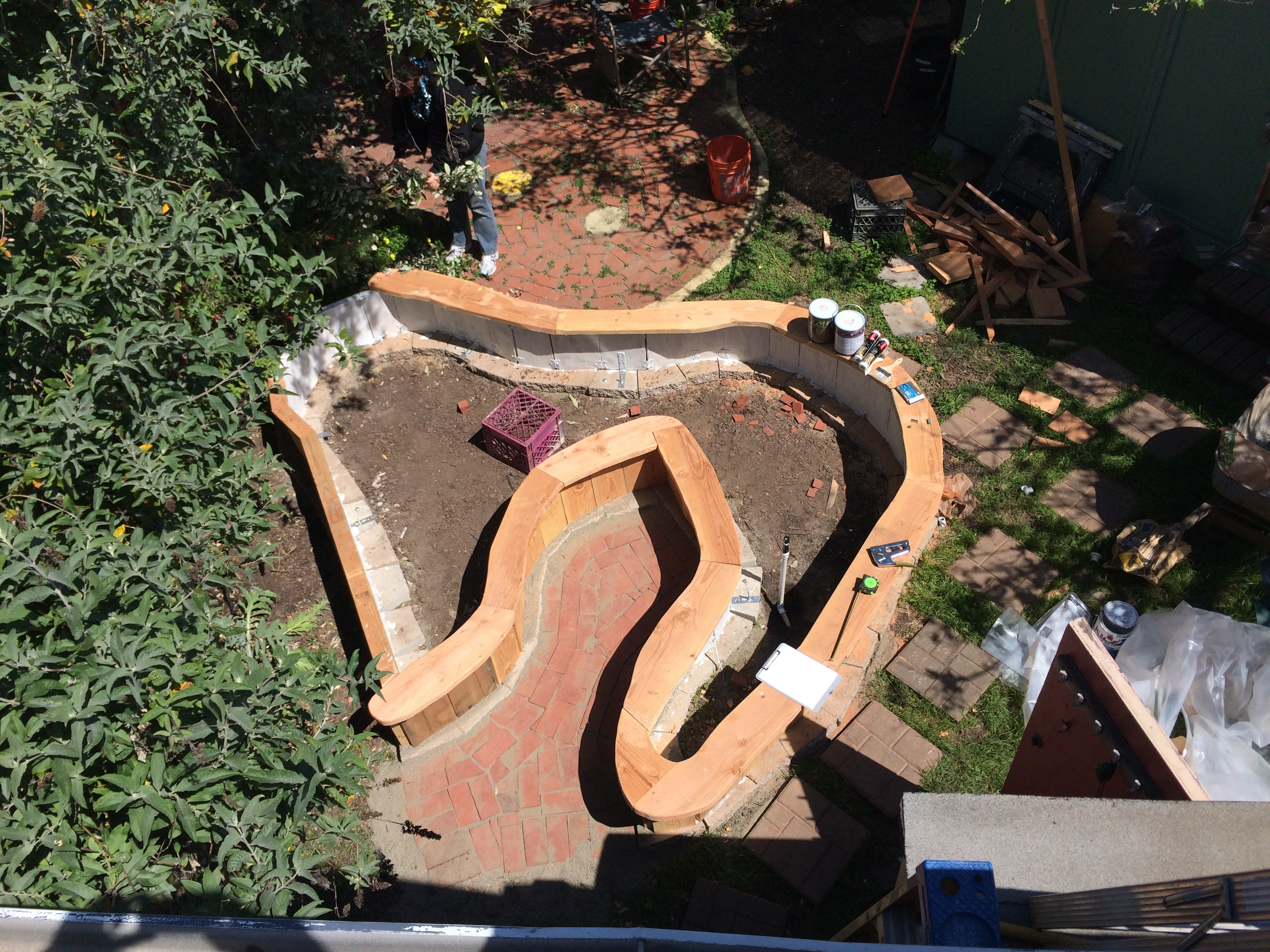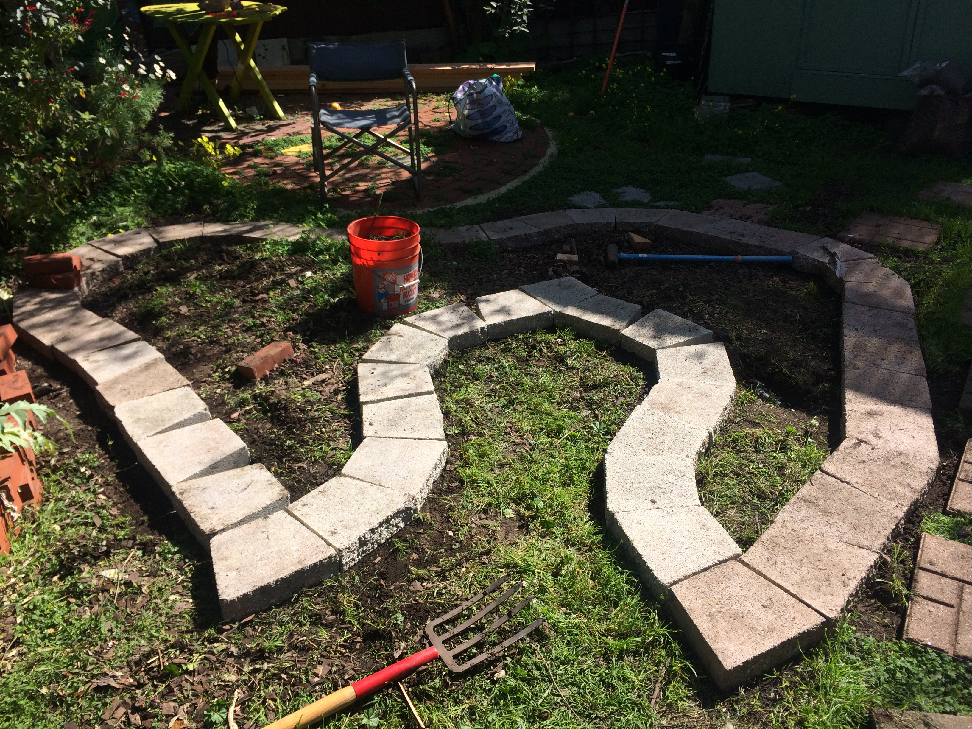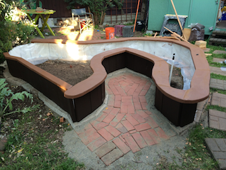 A 16” raised planting bed shaped like a large heart (if you include the brick keyhole area). The entire perimeter is lined with curved bench seating. An interior “keyhole” shaped space allows access to all parts of the garden. The floor of the keyhole is hand-cut brick on sand. The whole planter bed is made of 2x10s and 2x12s that rest vertically on a foundation of paving blocks. The bed is lined with clear plastic to prevent rot. The whole raised bed was painted brown.