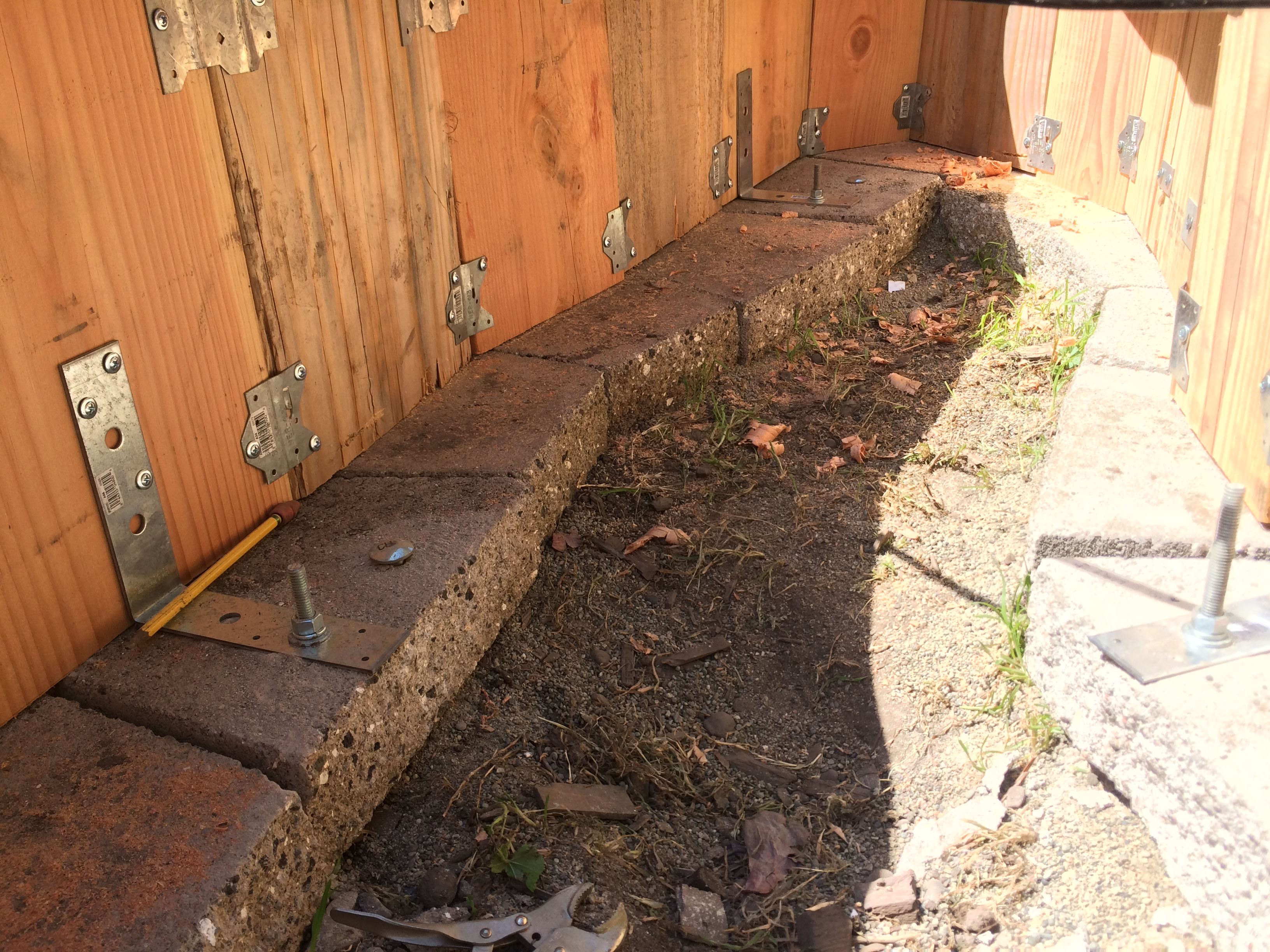This is a close-up view that shows how the vertical 2x10s and 2x12s are secured to each other and the foundation stones.
