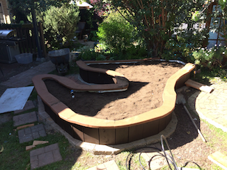 Here’s a view before it’s filled. You can see the entire interior is lined with thick plastic. You can also see the new PVC water pipe that runs to a repurposed valve that was controlled by a Rachio sprinkler controller I had installed earlier. After the bed was filled the PVC you see fed the drip irrigation system.