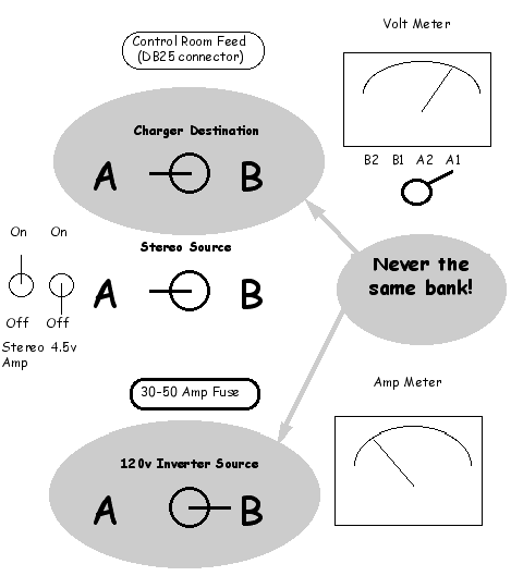 There is a computer connector (db25) at the top of the control panel. The other end of that cable terminates at a voltmeter in the control room of the Fishmobile. That meter allows the control room operator to check on the battery levels and warn the driver when it is necessary to change which bank feeds the 120v inverter.