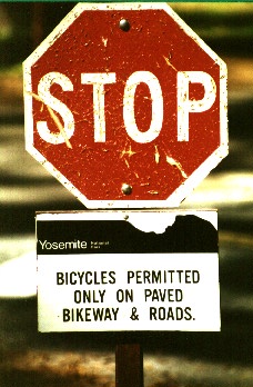 ![]() The Rules of the RoadThe pathway is interrupted by stop signs at several points near Yosemite Village. The stop signs will keep you from speeding through the Village, or getting hit by vehicular traffic, which is allowed on the Lodge and Village side of the park. Once you pass Curry Village or head toward Mirror Lake vehicles other than the park's Shuttle Busses are not allowed. One stop sign is at the bottom of a hill, unfortunately.
